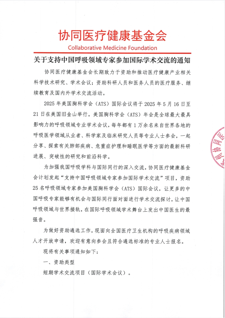 关于支持中国呼吸领域专家参加国际学术交流的通知